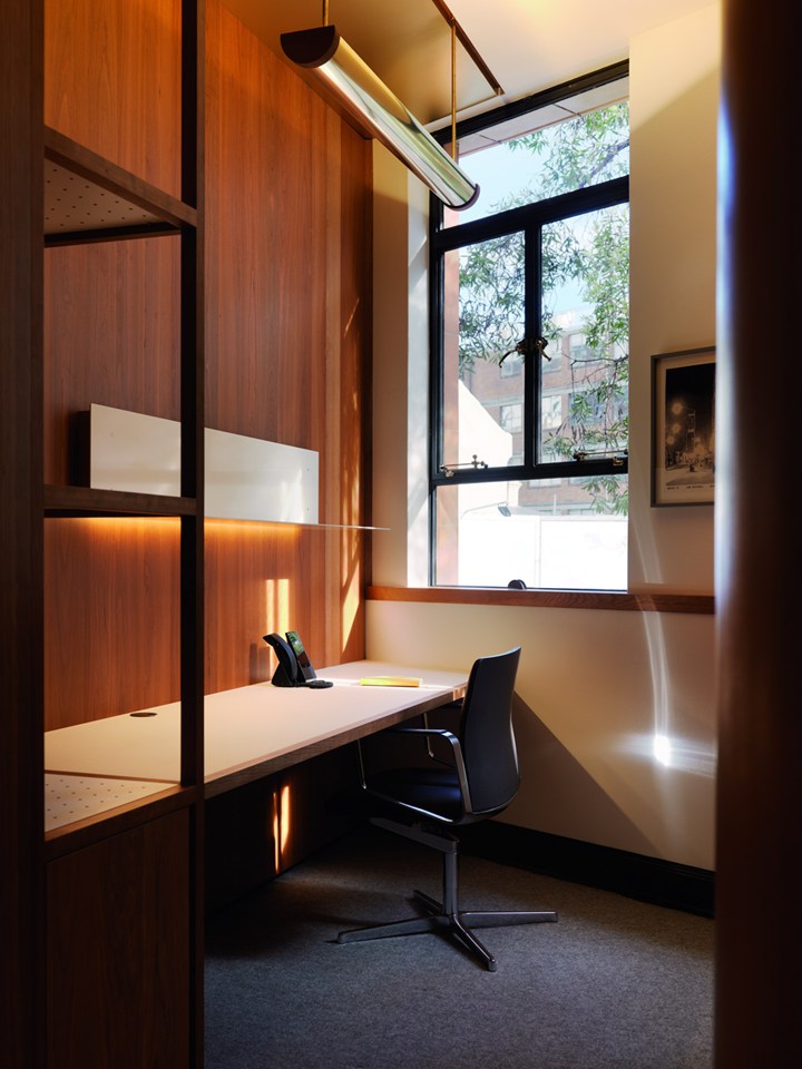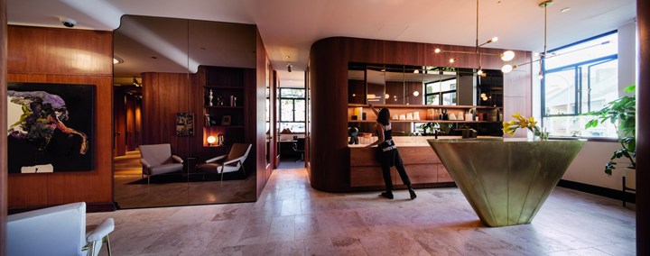 Проект включает использование американской вишни и латуни, что придает интерьеру роскошный и стильный вид. Дизайн вдохновлён эстетикой 1950-х годов.