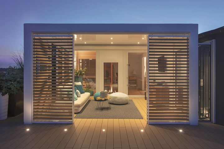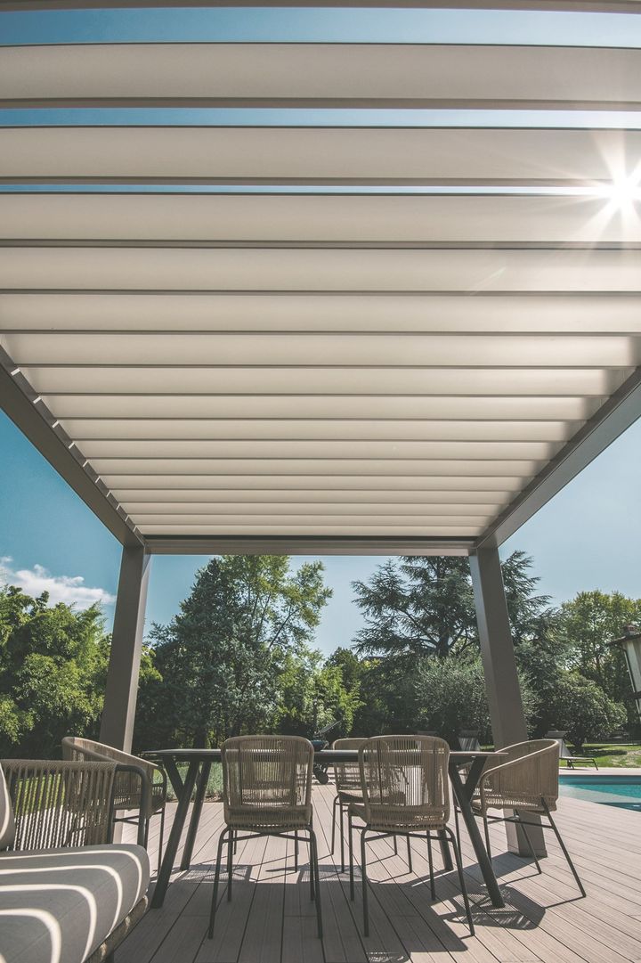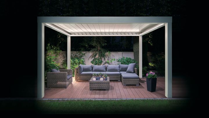 Модели R600 Pergoklima и R640 Pergospace оснащены регулируемыми ламелями и дополнительными функциями, такими как датчики дождя и светодиодное освещение.