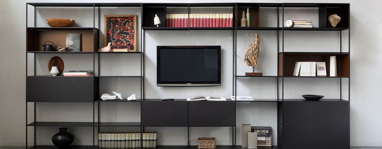 Easy Irony TV — это модульный книжный шкаф, который предлагает не только место для книг, но и удобную подставку под телевизор. Изготовленный из металла и доступный в двух цветах: медно-черный сабле и белый с тиснением, этот шкаф станет стильным акцентом в любом интерьере.