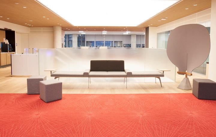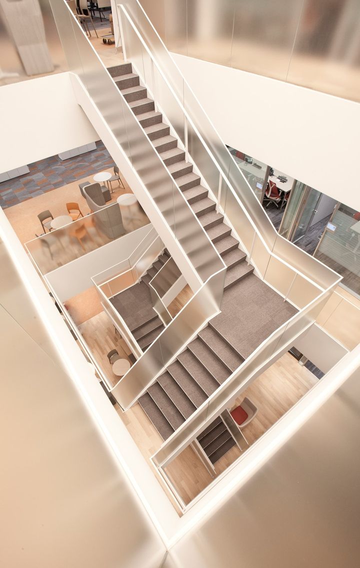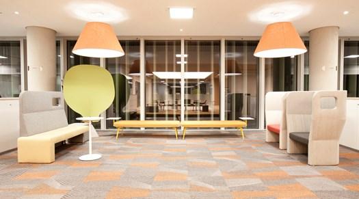 Штаб-квартира PWC представляет собой многоуровневое здание, где дерево и цвет играют ключевую роль в оформлении общих пространств. Яркие абажуры и ковровые покрытия добавляют динамики.