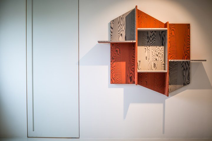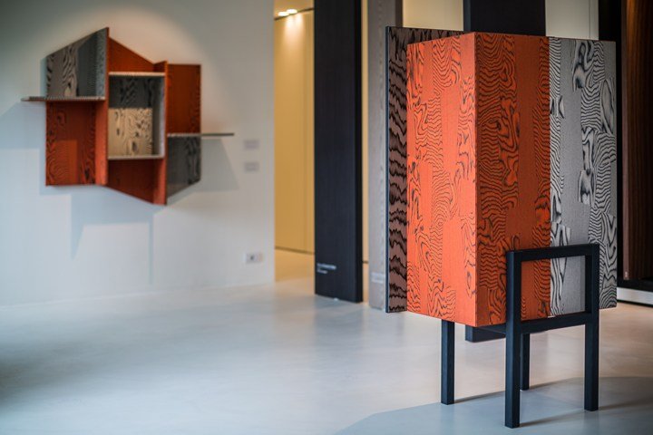 Мартино Гампер создал три уникальных предмета: шкаф, книжный шкаф и экран, используя древесину ALPI. Эти работы отличаются оригинальными линиями и цветами, создавая эстетический эффект, который притягивает внимание.