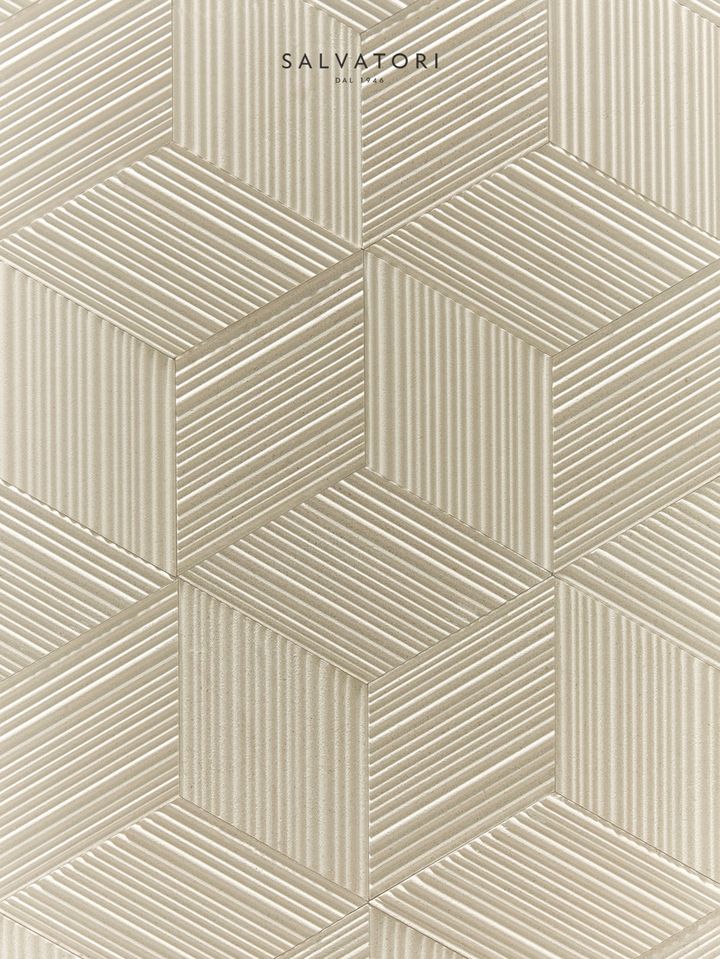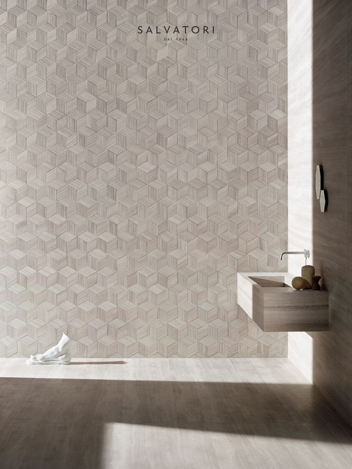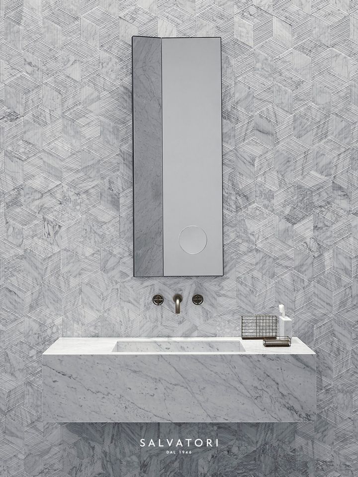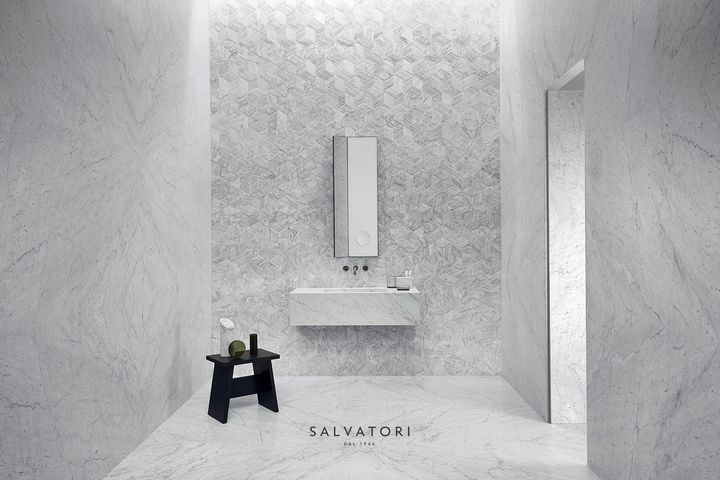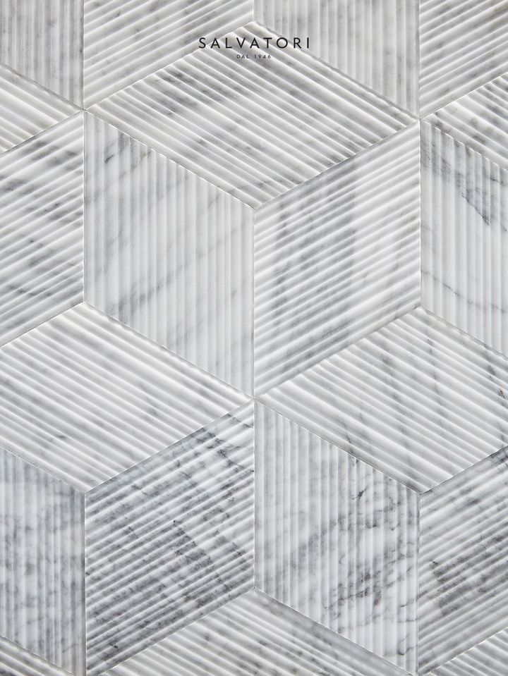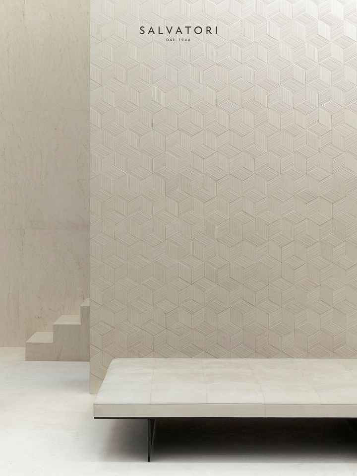 Salvatori предлагает Romboo — плитку, изготовленную из отходов мрамора. Она создает уникальные трехмерные эффекты при попадании света, что делает ее идеальной для использования в интерьере.