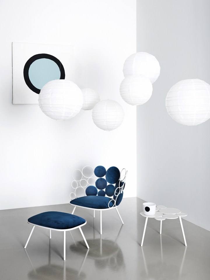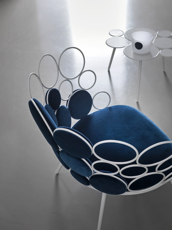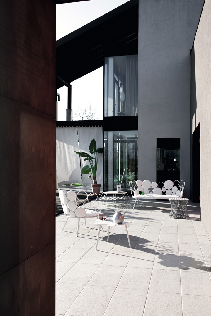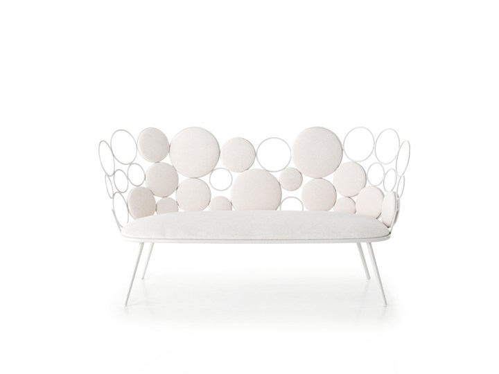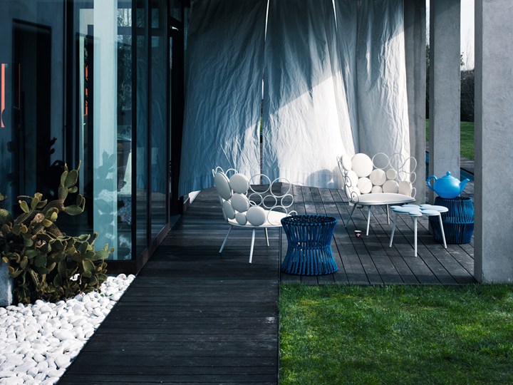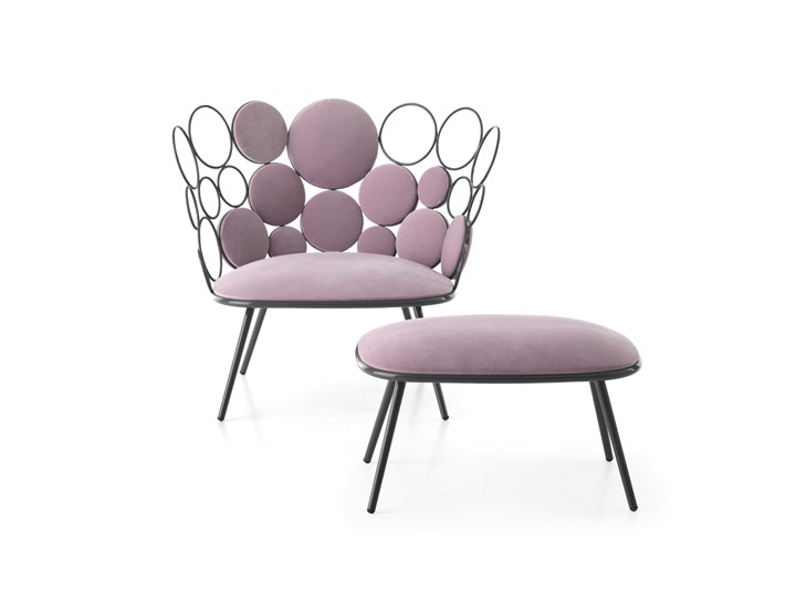 Коллекция включает кресла, диваны, столики и пуфики, которые отличаются легкостью и декоративностью. Металлические кольца и подушки создают гармоничные композиции, придавая мебели воздушность.