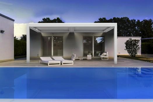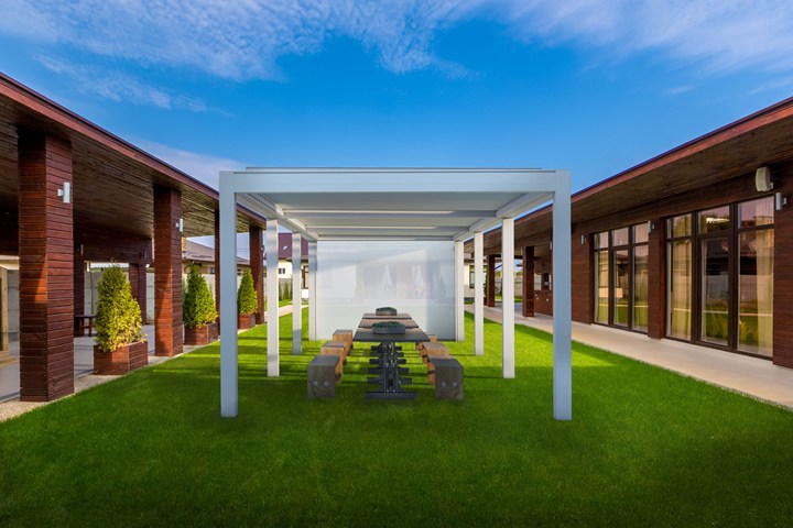 Пергола KEDRY PRIME обеспечивает защиту от солнца, ветра и дождя, легко адаптируется к любому пространству и оснащена светодиодным освещением.