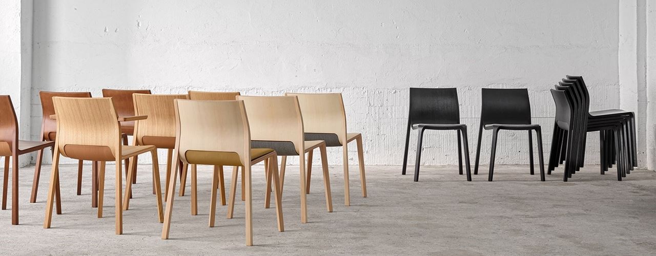 В коллекции представлены стулья из ясеня и дуба, которые могут быть использованы в различных функциональных пространствах. Их штабелируемость и эргономика делают их идеальными для как дома, так и офисов.