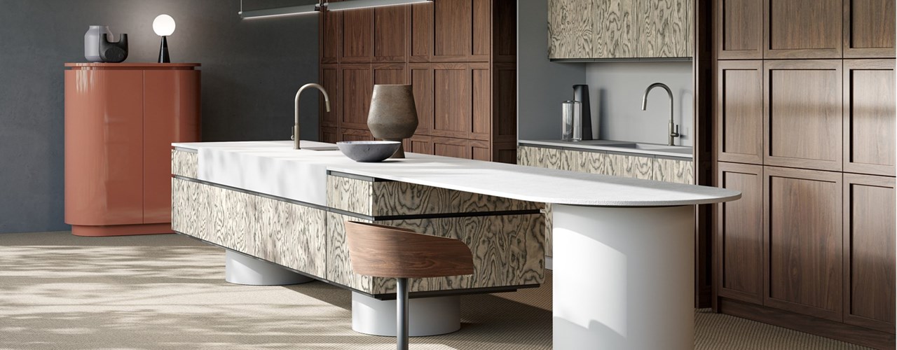 Новая кухня L'Ottocento предлагает множество моделей, в которых используется Lapitec. Например, кухонный остров с интегрированной индукционной варочной панелью и раковиной создает монолитный и современный вид. Доступны различные решения для хранения, включая панели Atlante, которые могут включать книжные полки или двери в другие помещения.