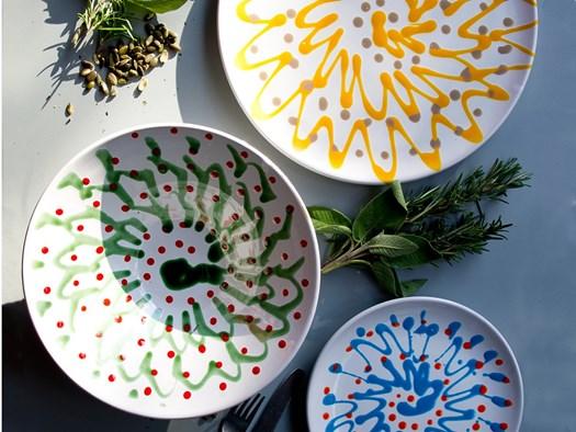Коллекция Unopiù включает керамические тарелки, рюмки и льняные скатерти. Материалы, такие как лен и керамика, создают ощущение простоты и стиля. Цвета вдохновлены природой: синий, зеленый, желтый и красный.