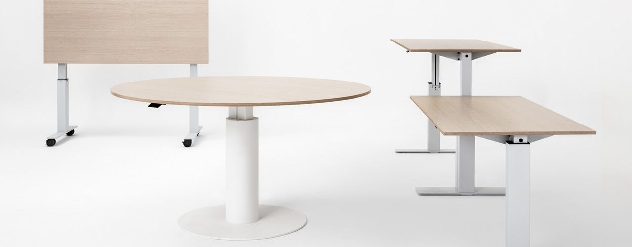 Коллекция включает в себя столы с механической системой регулировки высоты, что позволяет адаптировать рабочее место под индивидуальные нужды каждого сотрудника.