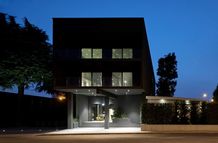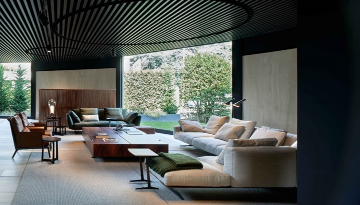 Реконструкция выставочного зала Flexform была проведена с учетом всех эстетических канонов и с использованием материалов, ассоциирующихся с брендом. В интерьере использованы травертиновые полы, деревянные потолки и большие стеклянные окна, создающие уютную атмосферу.