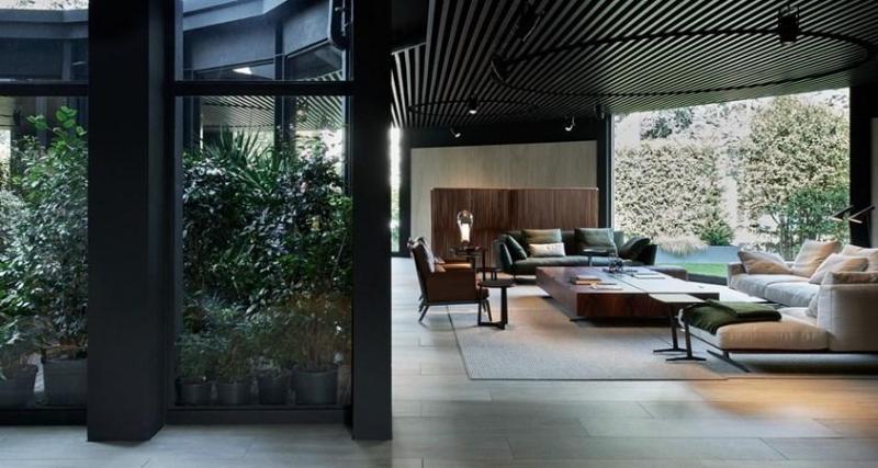 Реконструкция выставочного зала Flexform была проведена с учетом всех эстетических канонов и с использованием материалов, ассоциирующихся с брендом. В интерьере использованы травертиновые полы, деревянные потолки и большие стеклянные окна, создающие уютную атмосферу.