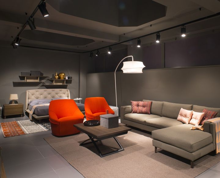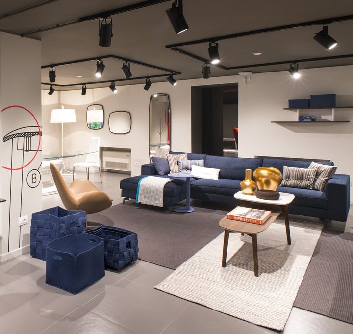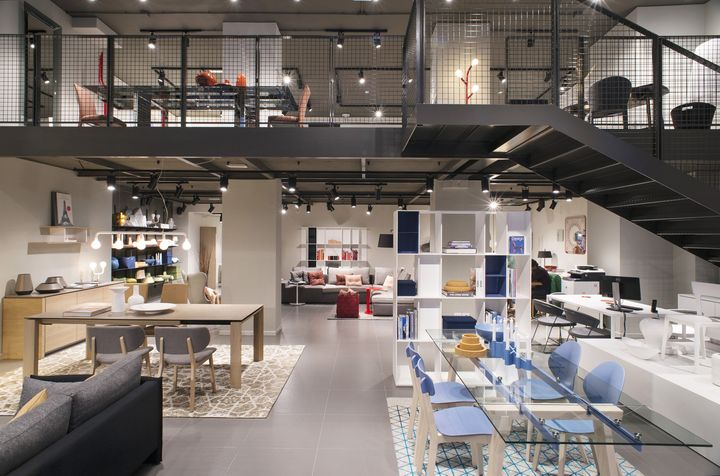 Металлическая лестница и палитра серых тонов создают атмосферу открытости и уюта. Мебель Calligaris подчеркнута в каждом уголке магазина.