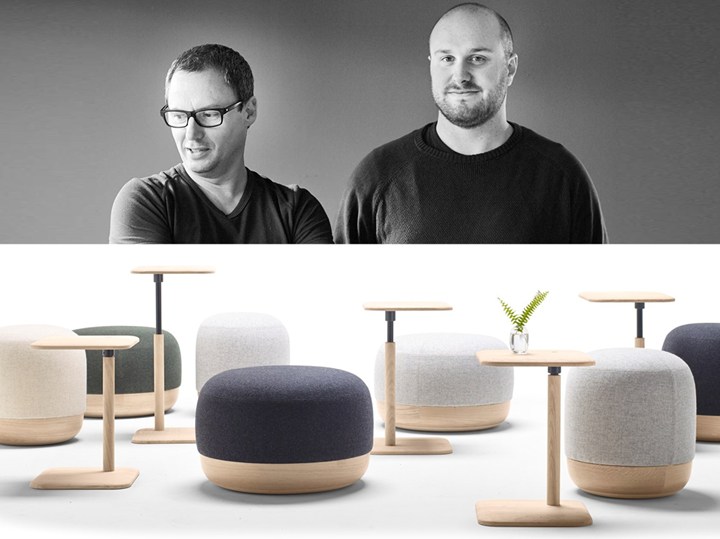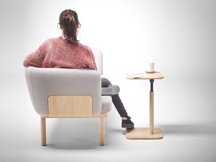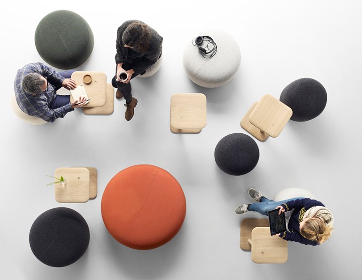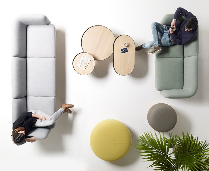 Коллекция включает в себя диваны, столы и пуфы, которые можно комбинировать для создания уютной рабочей среды.