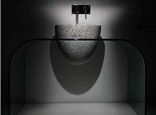 Stone Drops выполнена из агломерации мраморной гальки и смолы, что придаёт ей уникальный внешний вид и прочность. Она дополнена стеклянным основанием, которое делает её визуально легкой.