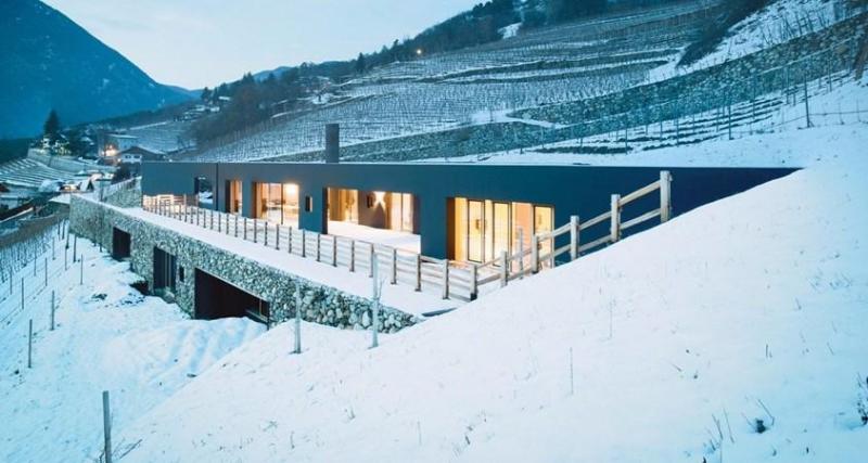 Использование натурального камня и виноградников для создания симбиоза между зданием и окружающим ландшафтом.