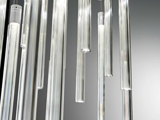 Multispot позволяет полностью адаптировать освещение под проект. Она включает в себя различные формы и материалы, такие как хрустальные сферы и элементы из боросиликатного стекла, что делает её подходящей для любых интерьеров.