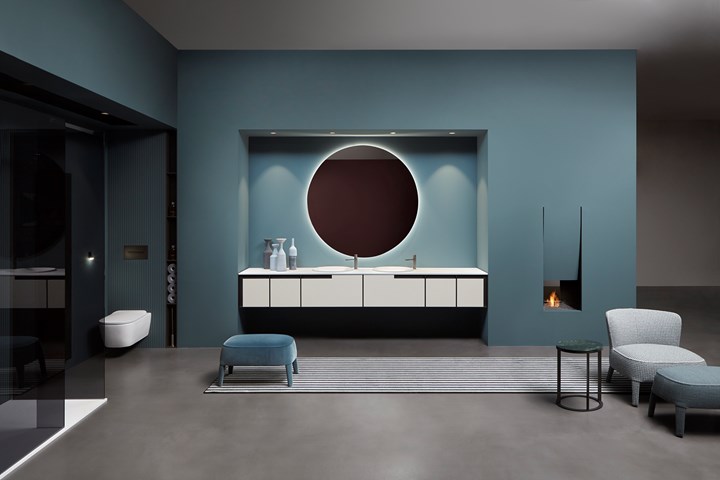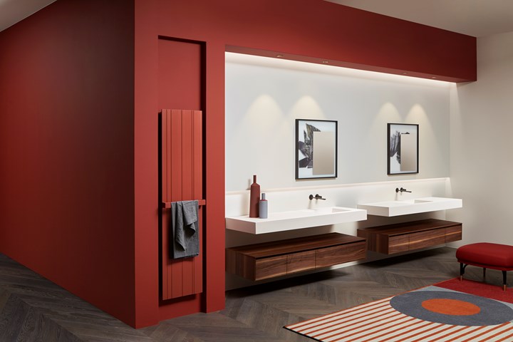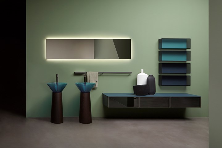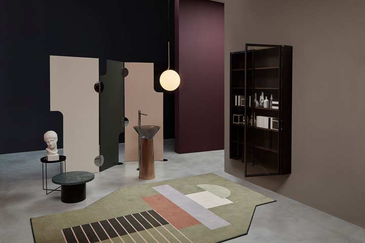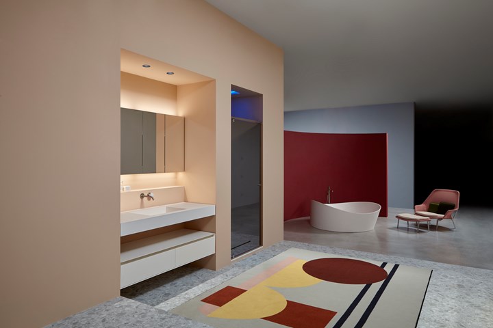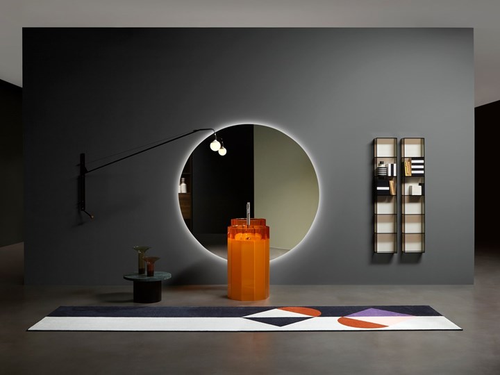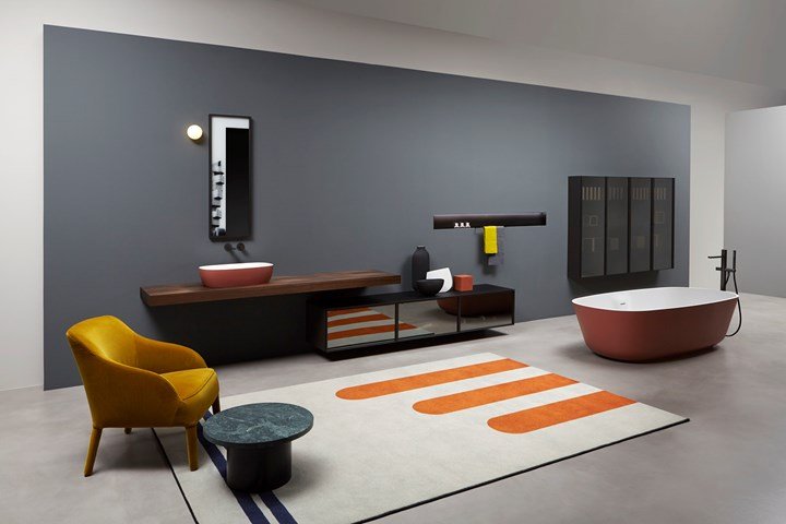 Обновленное пространство antoniolupi отличается уникальными цветовыми решениями и сценографическими декорациями, создающими гармоничный интерьер.