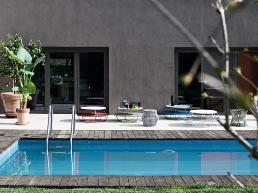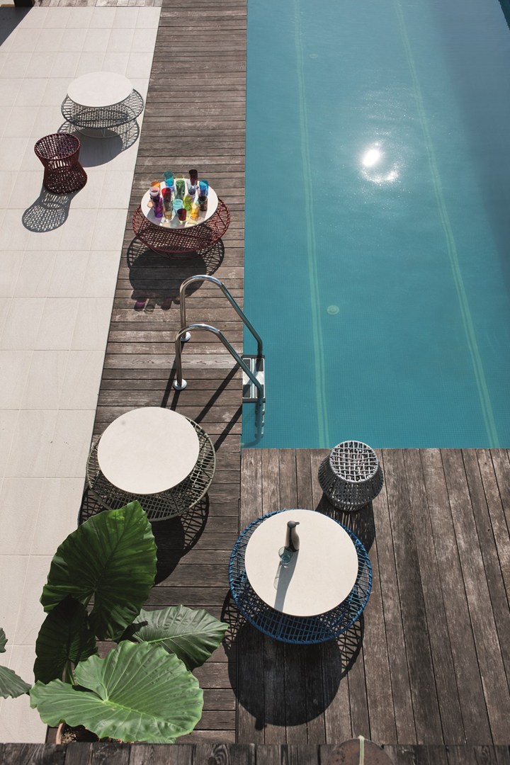 Столик Ziggy XL от Saba Italia доступен в четырёх цветах: красный, синий, серый и шалфейно-зелёный. Он оснащён мраморной столешницей Thala и нижней плетёной столешницей из морской верёвки, что придаёт уникальный вид и прочность.