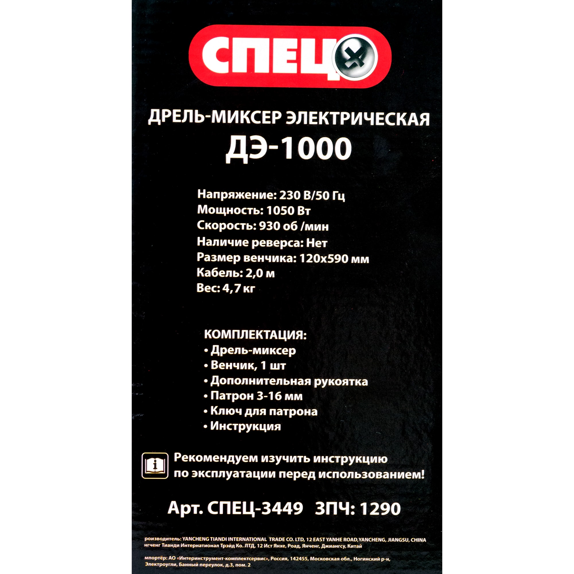 Дрель-миксер СПЕЦ ДЭ-1000 с дополнительными рукоятками 88309474 STLM-0077527