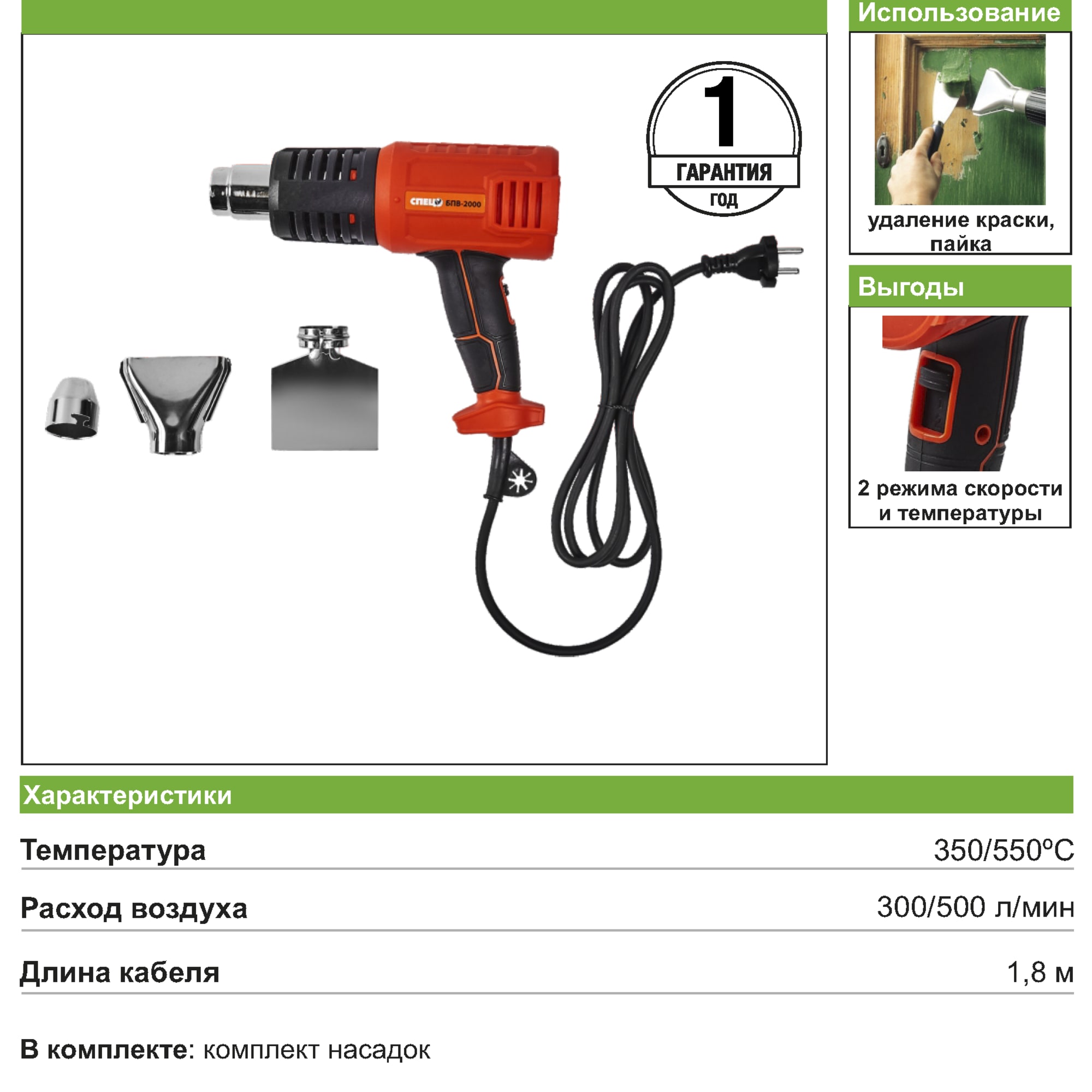 Технический фен СПЕЦ БПВ-2000 с двумя режимами нагрева 86511786 STLM-0069503 предоставляется с гарантией 12 месяцев с момента покупки.