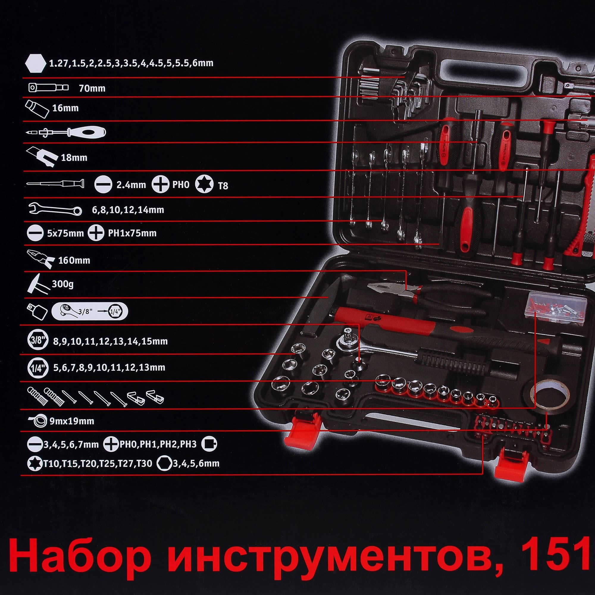 | Состав комплекта | комбинированные гаечные ключи с трещоткой, воротки, удлинители, отвертки, нож с сегментированным лезвием, большой молоток и плоскогубцы, торцевые головки на 3/8" и 1/8", гвозди, дюбели, насадки и адаптеры, упаковка изоляционной ленты. |