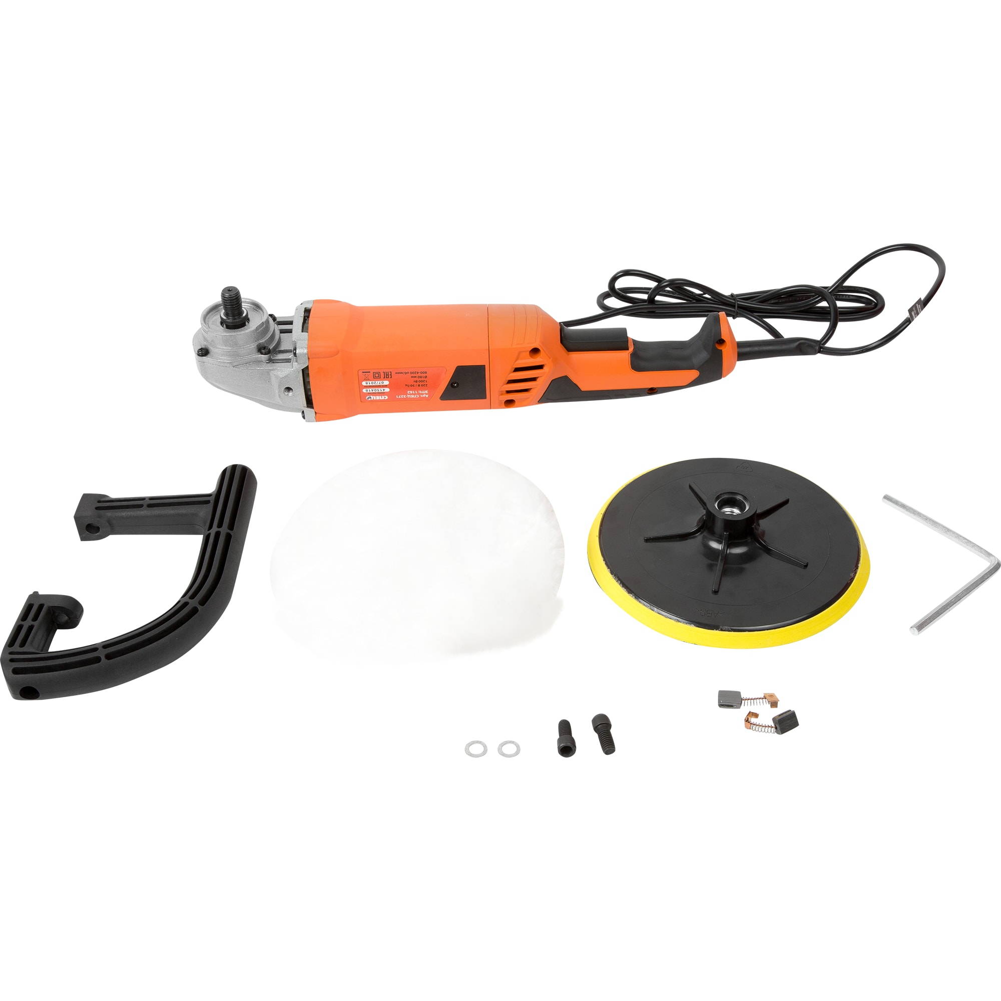 В набор входят две полировальные насадки, опорная тарелка, ключ и комплект запасных щеток. Регулярно очищайте устройство от пыли и проверяйте состояние щеток для поддержания оптимальной производительности.
