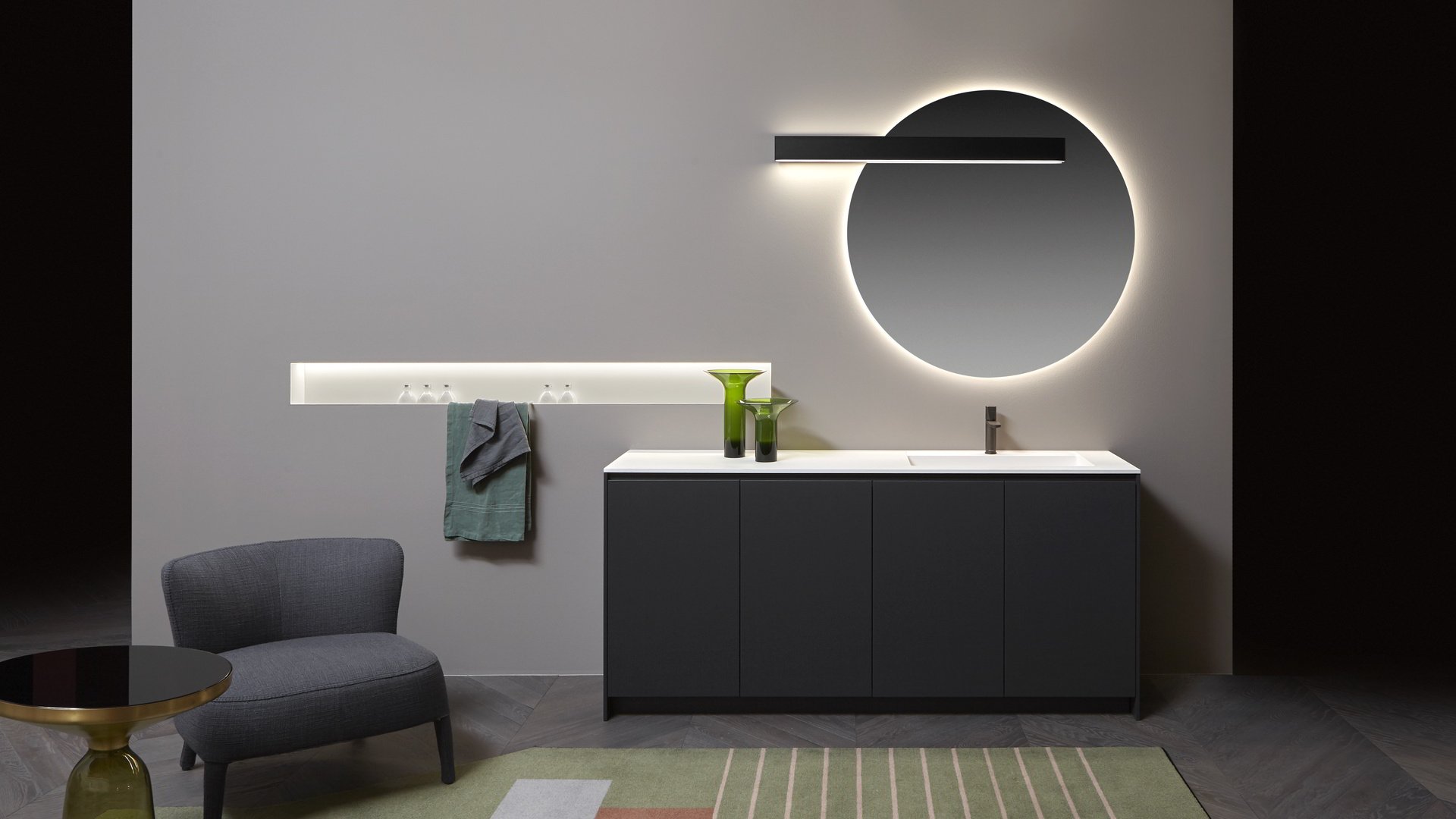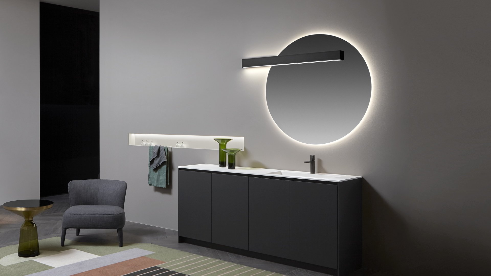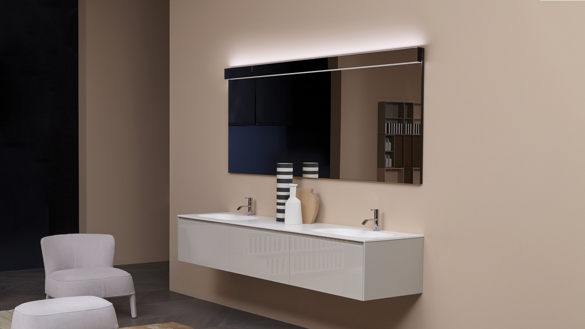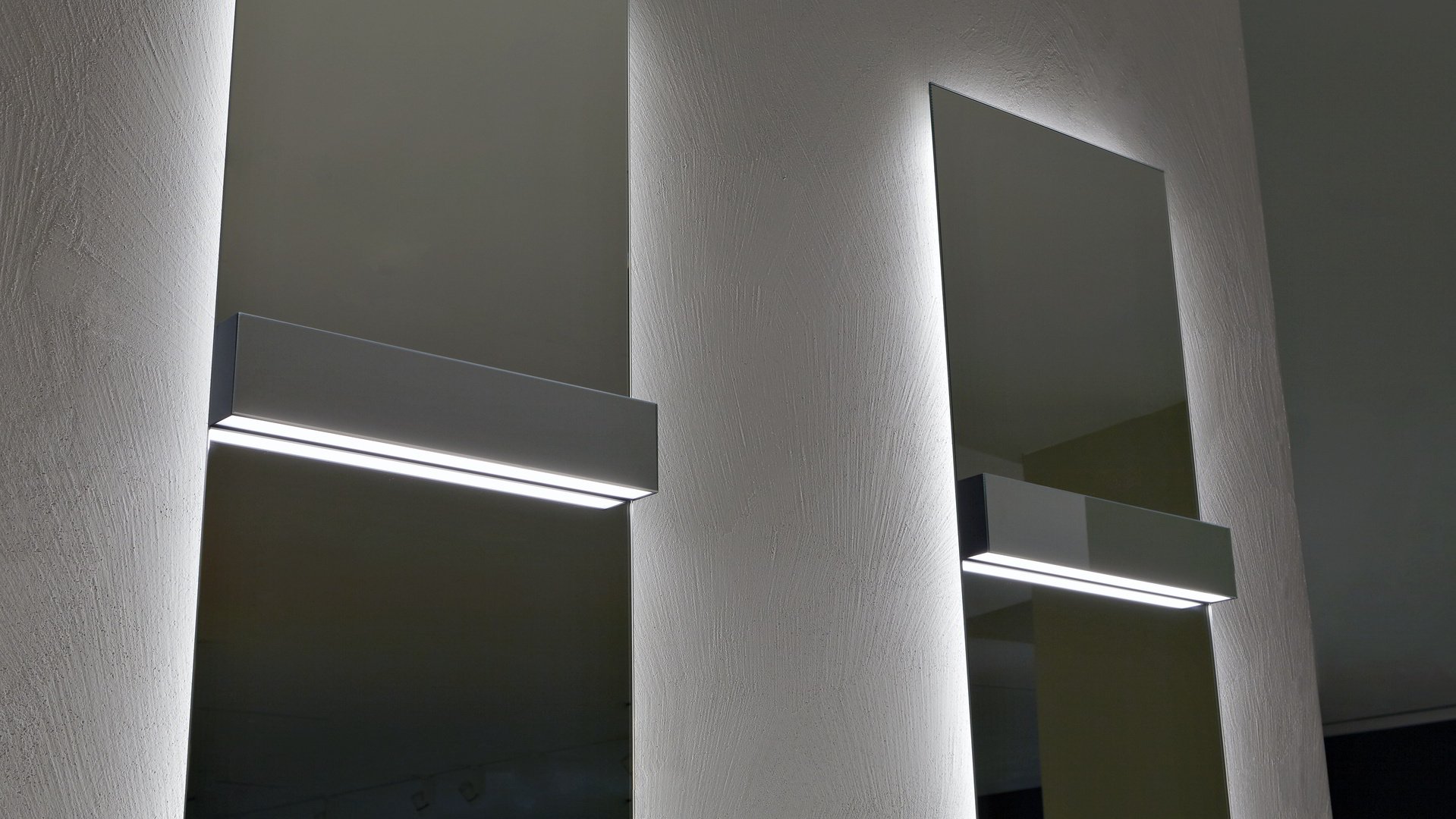 Незаменимый и строгий, способный полностью исчезнуть из поля зрения, когда он не работает, и волшебным образом появляется снова после включения. Lucente - это лампа, сделанная из четкой и минимальной планки, которая благодаря своей зеркальной передней крышке идеально скрывается в самом зеркале. Оснащенная прямым и непрямым светодиодным освещением, она может принимать ту же ширину, что и зеркало, для действительно полной интеграции. Двойная подсветка позволяет создать атмосферный свет вверху и отлично осветить зеркало внизу. Минималистичное решение, в котором главными героями являются свет и отражения.
