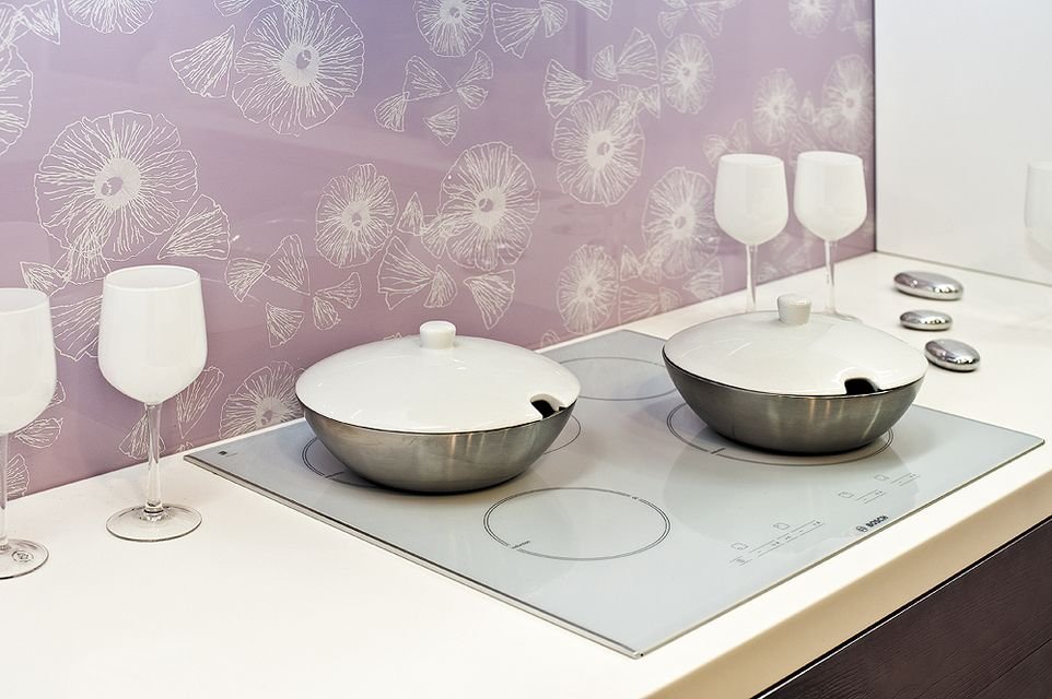 Достаточно стеклоочистителя и влажной тряпочки. На пёстрых и светлых декорах стекла брызги воды, кипящего масла и других жидностей совсем незаметны. Максимальный блеск стеклу придаст тканевая салфетка для полировки.