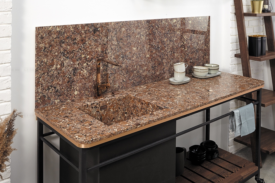 Поэтому имеются ограничения на изготовление столешниц с радиусами. Однако, LIGRON умеет обрабатывать кварцелан и изготавливать из него столешницы и стеновые панели с фигурными классическими профилями.