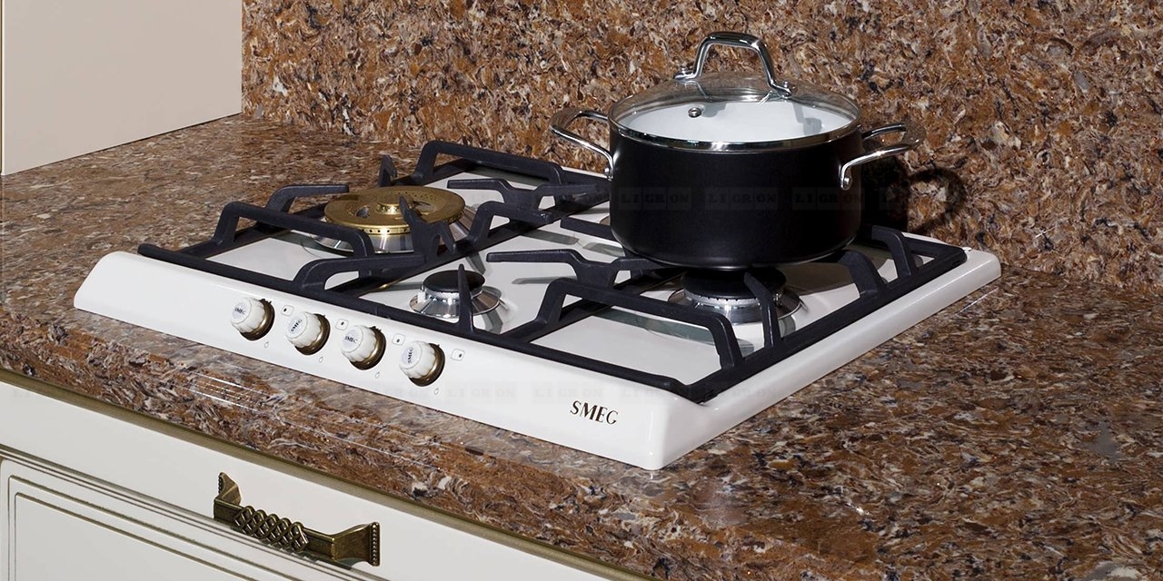 Обладает высокой теплостойкостью, стеновые панели можно размещать непосредственно за газовой варочной панелью. При этом ставить горячее на поверхность кварца нерекомендуется.