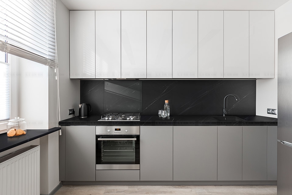 Компания Ligron предлагает большой выбор фигурных профилей, врезные мойки Stone Twelve в цвет столешницы, интегрированный плинтус и стеновые панели.
