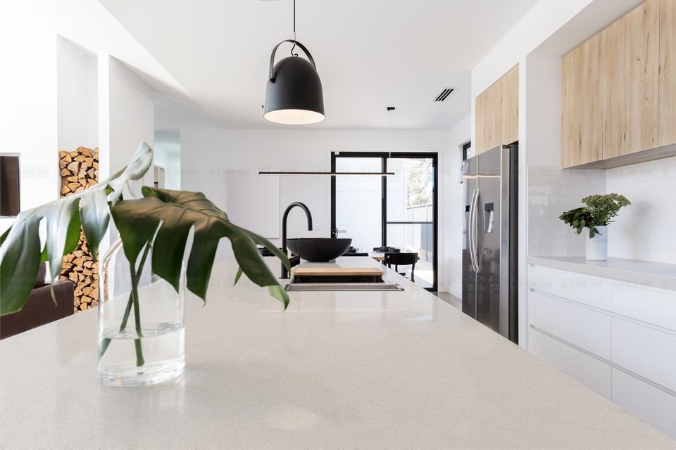 Обладает высокой теплостойкостью, стеновые панели можно размещать непосредственно за газовой варочной панелью. При этом ставить горячее на поверхность кварца нерекомендуется.