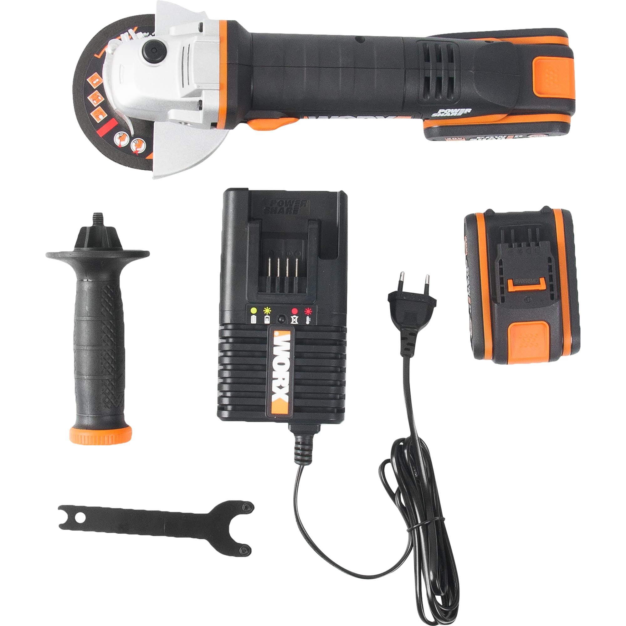 Аксессуары в комплекте 2 аккумулятора Li-Ion емкостью 2,0 А*ч, Зарядное устройство WORX 20В, Боковая рукоятка, Шлифовальный диск по металлу, Защитный кожух, Ключ.